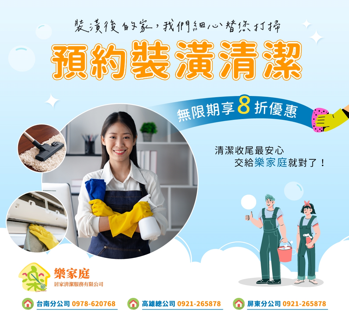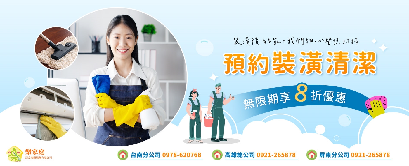 整天繁忙的工作結束後,回到家又要面對擾人的清潔打掃工作,使得人們的快樂指數也越來越低。 而樂家庭居家清潔公司成立的宗旨就是要提供客戶百分百舒適的環境與快樂的心情。